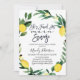 Este chá de panela de limão apresenta uma caligrafia de pincel em preto e uma fruta de limão e coroa floral. O verso do convite apresenta um limão e um padrão foliar. Este chá de panela com o tema dos citros é uma forma doce de convidar convidados para um chá de panela que está por vir.