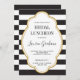 Um convite com riscas pretas em negrito e estrutura dourada para um chá de panela ou festa de solteira de vidro.