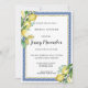 A fruta de citrinos legal e refrescante cria sempre belas exibições e refrescos. A coleção de limões da Jenny pega limões de aquarela e os emparelha com azulejos azuis mediterrânicos. Neste design, os azulejos criam um quadro azul. Uma fina armação de ouro a eleva. Dois buquês de limão adicionam um toque floral. Ela achou que o "Main Squeeze" está escrito no topo. Seguem-se os restantes detalhes do chá de panela.