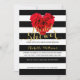 Chá de panela elegante/moderno com bela rosa vermelha em forma de coração e fundo de listras preto e branco.