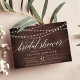 Nossos convites de chá de panela elegantes rústicos apresentam um fundo falso em placas de madeira com cordas de luzes brancas na parte superior, e "chá de panela" na tipografia de scripts de caligrafia. Personalize com seu chá de panela e detalhes do registro abaixo em letras brancas.