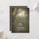 Chá de panela romântico ao ar livre. O convite russo apresenta árvores velhas e uma série de luzes penduradas nos galhos. A Woodland inspirou o convite com uma atmosfera de conto de fadas. Para noiva que ama a natureza.