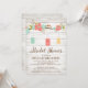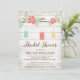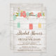 Chás de panela da madeira do frasco de pedreiro. Mão rústica frascos de pedreiro tirados que penduram de um ramo de árvore com flores e fundo da madeira do celeiro. Cores modernas do azul, do coral, do amarelo, do verde e do marrom macios da hortelã. Personalize com as iniciais dos noivos. Um design popular para um chá de panela do país ou o chá de panela temático da queda convidam. Personalize facilmente com seus detalhes do evento.