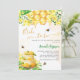Um fundo branco na moda e ouro de cor d'água. Decorado com abelhão, derretendo mel e favos de mel com flores amarelas, flores e bolo de casamento com limões. Com o texto: Noiva a ser escrita com um moderno estilo escrito à mão. Personalize e adicione o nome da noiva à abelha.