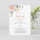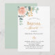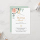 Um fundo branco chic. Decorados com ouro-rosa e folhas de eucalipto cor-de-rosa-esbranquiçada, flores de rosa e cor-de-rosa-esbranquiçada, galhos, verde-verde e um cinzeiro de ouro falso. Personalize e adicione o nome da noiva a ser e os detalhes da festa. Letras pretas e ouros coloridas. Verso: cor verde do fundo.
