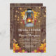 Convites de chá de panela de campo russos com fundo de celeiro de madeira, folhas de outono, uma lanterna acesa de vela, luzes cintilantes de cordas e uma modelo de noiva moderna.