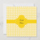 Padrão de quatrefoil amarelo monograma em convites de chá de panela brancos de fundo.