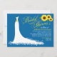 O chá de panela elegante da futura noiva na moda apresenta uma letra de roteiro de caligrafia de ornamentado e um vestido de noiva fluente com detalhes de girassol. Cor branca, azul cobalto, verde, amarela e design castanha.