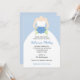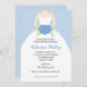 Simples mas doce chá de panela com vestido de noiva em fundo bolinhas azul.