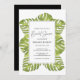 Tendy tropical design com palmas verdes e uma tipografia moderna manuscrita, ideal para um casamento na praia ou uma festa de verão.