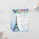 A sensação macia, romântica com torre Eiffel contra um fundo azul pastel e um pop brilhante da aguarela florescem a dança através da parte superior. Original, fresco e moderno com primavera colorido floresce. Azuis, roxos, verdes, e um respingo do vermelho - aperfeiçoe para o casamento temático francês ou francês. Edite facilmente para seu próprio convite do chá de panela ou do casamento. Apresente seus convites no estilo!