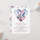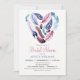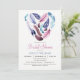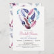 Chá de panela de penas roxa, rosa e violeta. Convidam penas em forma de coração na frente, com padrão personalizado atrás.
