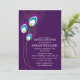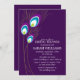 Convite elegante e clássico apresenta uma bela ilustração vetorial de penas de pavão num fundo roxo profundo. Perfeito para casamentos, chás de panela, festas de aniversário, doces dezesseis festas e mais!