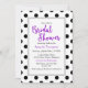 Moderno e tão chique, este chá de panela personalizado de aparência de designer apresenta bolinhas de moda pretas com uma imagem brilhante prateada e acentos de letras roxas. Pronto para personalizar com os detalhes do seu chá de panela substituindo o texto de exemplo mostrado. Para adicionar ou remover linhas de texto, escolha o botão "personalizá-lo".