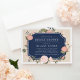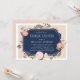 O chá de panela floral elegante apresenta uma placa azul marinho com os detalhes do seu chá de panela e rodeada por flores cor-de-rosa e creme pinceladas, verde-luxuoso e pequenos botões. Personalize com os detalhes do seu chá de panela em letras brancas elegantes. Cartões invertem para um padrão sutil de videiras em rosa-pincel e marfim.