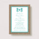 Estes monogramas de turquesa no chá de panela da praia de burlap farão o anúncio perfeito para qualquer noiva! A design apresenta um lindo fundo de efeito de burlap rustico com dois monogramas giros e giros. Esses convites podem ser personalizados para sua ocasião especial e farão o anúncio perfeito para qualquer casamento na praia, chá de panela, festa de noivado, festa de aniversário e muito, muito mais. *Observe que o Zazzle só vende convites impressos para que esses convites não tenham nenhum material de burlap real.