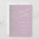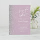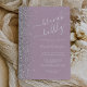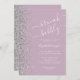A borda esquerda deste elegante e moderno brunch e chá de panela borbulhante apresenta uma borda cintilante prateada. O texto personalizável combina manuscrito branco, fontes em copperplate e itálico em um fundo lilático empoeirado. O verso apresenta um design de lilás e prata correspondentes.