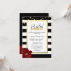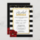 Design elegante com confete dourado falso e fundo de listras negras e brancas. Cartões de convite de festas de chá de panela moderno, moderno, mas elegante. Rosa vermelha no canto da placa. Faux foil de ouro e confetti. Todo texto pode ser editado com fonte e tamanho. Não se esqueça de combinar adesivos de favor!