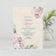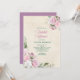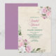 Este chá de panela apresenta uma lavanda pastel bonito e bordas de buquê rosa-rosa no canto superior direito e inferior esquerdo. As flores estão aninhadas em folhas verdes macios, e a borda de cima tem uma camada de confete de ouro cintilante. No centro está seu texto personalizado em verde. As imagens e o texto são colocados sobre um fundo de imagem de papel pálido creme. A parte de trás do convite é uma violeta de lavanda que corresponde a sólida, e também tem a camada de confetti. Bonita para primavera e chás de panela de verão.