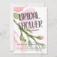 Um chá de panela novo e moderno com um grande ramo floral cor-de-água rosa e verde, sobreposto com a frase "chá de panela" em letra escrita com pincel de cinza escura, e detalhes do evento em letra moderna. O reverso está em verde sólido sobreposto com um padrão de círculo sobreposto.