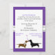 chá de panela bonito feito em um fundo roxo sólido, com uma fita branca com aspecto de uma placa, do outro lado do meio. Uma área de texto branco sobre a fita é decorada, com um dachshund marrom e preto, com corações lavandas entre eles. Todo o texto é personalizável para atender às suas necessidades de evento. Adorável convite de chá de casamento para a noiva ser querida.