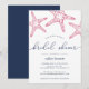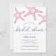 Nossos convites de chá de panela costeiros apresentam estilo náutico clássico com um olhar limpo e minimalista e um toque leve da vida marinha. Design apresenta três ilustrações vibrantes de estrelas-do-mar cor-de-rosa no topo, com os detalhes do seu chá de panela embaixo de uma combinação chic de serif azul marinho e sans serif lettering. Perfeito para chás de panela de tema náutico, verão ou praia.