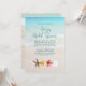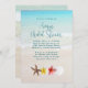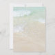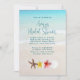 Convites de chá de panela com design de praia tropical. A água azul turquesa e a imagem de areia praia são o fundo para a sua escolha de texto. Uma fileira de flores e conchas de praia decoram o fundo. O texto é azul-marinho.