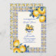 Chá de panela temático limão com ilustrações aquáticas dos limões, flores de limão e padrão de azulejo mediterrânico. Personalize adicionando nomes, data, hora e outros detalhes. Este chá de panela de limão é perfeito para casamentos de verão e chás de panela temáticos mediterrânicos.