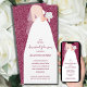 Uma noiva em seu vestido de noiva sobrepõe um padrão branco de esboço de rosa nestes convites de chá de panela vermelhos de amora. CORRESPONDENTE a itens na nossa coleção.