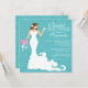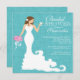 O convite para chá de casamento de noiva Na moda moderna apresenta uma noiva moderna chic brindando com uma taça de vinho, enquanto segura um belo buquê de flores para casamentos cor-de-rosa gravadas em um papel de fundo azul azul turquesa popular, com texto branco destacado. Nosso chá de panela moderno de noiva é perfeito para uma celebração popular de chás de panela de vinho. Visite nosso compro para ver este belo chá de panela em uma grande seleção de cores de buquê floral e diferentes variações de noiva.