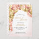 Este chá de panela apresenta um gráfico elegante de um arco de balão nas cores de rosa, rosa e ouro. O design é acentuado com texto dourado.