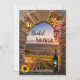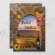 Chá de panela com pintura de um pôr do sol numa vinha enquadrada por um clássico arco romano com uvas, vinho, lanterna e girassol. Você tem várias opções para o plano de fundo no verso do convite. Use o editor avançado para acessar tudo. Um modelo de código QR é adicionado para sua conveniência. Um belo convite para uma celebração em um vinhedo ou chá de panela em um bar de vinho.
