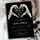 Chá de panela do Dia das Bruxas de Amor Gótico Negro. Chá de panela temático minimalista do Halloween, com um esqueleto de mão pintado manualmente a aquarela em forma de coração, escrita de caligrafia e simples design. Fundo preto em frente e atrás. Você pode personalizar o texto, o estilo da fonte, a cor e o tamanho em frente e atrás do convite.