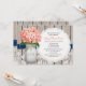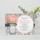 Os chás de panela monogrammed do frasco de pedreiro do estilo rústico bonito com as flores corais do hydrangea e uma cor damasco de madeira da cerca e da antiguidade atam o fundo e a fita de azuis marinhos costurada. Estes convidam podem ser personalizados com as iniciais e o monograma dos noivos no frasco de pedreiro. Estes convidam são perfeitos para um país, uma casa da quinta, um partido de jardim ou um chá de casamento do estilo do barnyard. Projetado por Chrissy H. Estúdio, LLC.