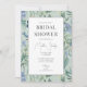 O chá de panela elegante apresenta fundo de menta com hortênsias azuis, flores amarelas e verde.