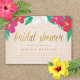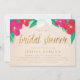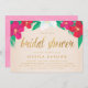 Lindas flores tropicais, cor-de-rosa, vermelhas e brancas se emparelham com texto dourado nesses convites de chá de panela florais tropicais.