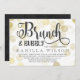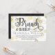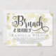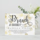 Chá de panela para um brunch de champanhe, com bolhas douradas espalhadas sobre fundo branco. Brunch e Bubble são escritos em uma fonte encantadora e giro. A parte de trás apresenta um impressão de mármore escuro de cinza.