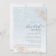 Este convite cômico apresenta um fundo texturizado de cor azul macia, acentuado com poeira de ouro e uma flor branca.