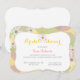 Este chá de panela em forma de colchete apresenta um fundo texturizado em ouro com uma colagem de círculos coloridos e margaridas brancas. Uma forma de colchete branco na parte inferior do convite contém texto personalizável para os detalhes do seu chá de panela.