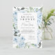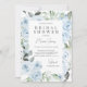 O chá de panela elegante convida com hidrangeas azuis empoeiradas e florais verdes.