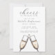 Convites de chá de panela com um esboço manual de óculos de champanhe. Este design apresenta duas bebidas que estão fazendo um aplauso. Há também um anel de noivado. Simples, moderno, e design mínimo perfeito para uma celebração de casamento. Personalize e personalize para adicionar seus próprios nomes e detalhes.