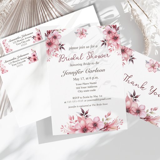 Convites de chá de panela florais elegantes. Lindas flores em tons de rosa com uma dica de verde, azul e burgundy.