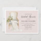 Chá de panela apresenta uma elegante cadeira bespoke tirada com flores e véu de casamento sobre fundo rosa-pinto-claro. O nome do casal ou as informações do site de casamento podem ser colocados no verso.