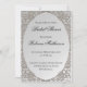Um anúncio de na moda, chá de panela prateado com um padrão decorativo de renda prateada em volta do texto personalizado no centro da placa. O quadro ornamental também aparece do outro lado da placa, com um dentro monograma personalizado junto com os detalhes de RSVP. Este convite para chás de panela tão chic e tão elegante faz parte de uma suíte maior de artigos de papelaria, que também inclui convite para casamento, anúncio de festa de aniversário, favores de casamento e muito mais, que vocês podem ver aqui: https://www.zazzle.com/collections/elegant_metallic_silver_lace-119345864697786840