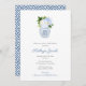 Azul clássico e florais brancos em um vaso de gengibre para este design de convite. Eu defini o modelo para um Chá de panela, mas todos os campos de texto são personalizáveis para suas necessidades.