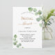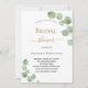 Um fundo branco decorado com cinzas de eucalipto verde. Personalize e o nome da noiva a ser e os detalhes da festa. Letras pretas e ouros coloridas. Fundo verde.
