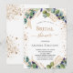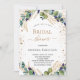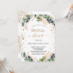 Um fundo branco decorado com verde de eucalipto e folhas de ouro e pó de ouro falso. Personalize e a noiva para ser o nome e os detalhes da festa. Letras pretas e ouros coloridas. Traseira: fundo branco com poeira brilhante ouro.