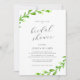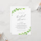 Um simples design de chá de panela com a cor d'água, folhas de eucalipto nos cantos superior esquerdo e inferior direito. Seus detalhes de chá aparecem no meio em letras elegantes de script e tipografia clássica.