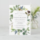 O chá de panela botânico elegante enquadra seus detalhes do chá de panela com uma borda de folhas de eucalipto de cor d'água, flores azuis e folhagem verde. Convites inverso a marinho enfumaçado sólido azul.