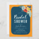 Chá de panela com flores e folhas contra fundo laranja e azul, com efeito ligeiramente angustiante para um olhar rústico à frente, perfeito para um evento de outono. O convite tem um padrão de bolinhas laranja contra fundo azul com um efeito ligeiramente angustiante para um olhar rústico sobre o verso. Personalize este convite com seus detalhes substituindo o texto do marcador de posição. Para obter mais opções, como alterar a fonte, o tamanho/cor do texto, o espaçamento entre letras ou para contrair ou expandir o texto curvo, clique no botão "Personalizar". *Observe que a Marca d'água do Zazzle que aparece na visualização de zoom NÃO aparecerá no produto impresso final. © Rosewood e Citrus